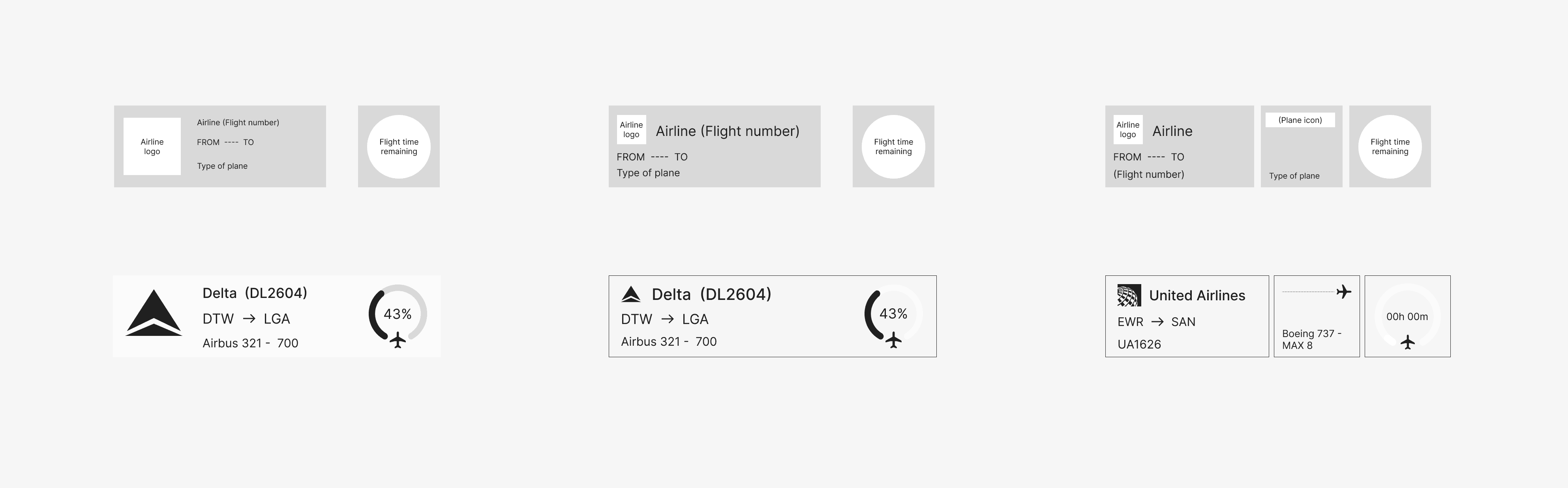 Then it was time to focus on how to translate dense flight data into a clear, digestible interface by prioritizing only the most relevant information at a glance. Through experimentation with hierarchy, spacing, and typography, I emphasized key details like airline, altitude, and route while keeping secondary data minimal to maintain clarity within a constrained widget space.
